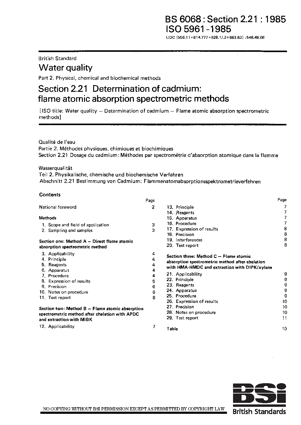 Water quality. Physical, chemical and biochemical methods Determination of cadmium: flame atomic absorption spectrometric