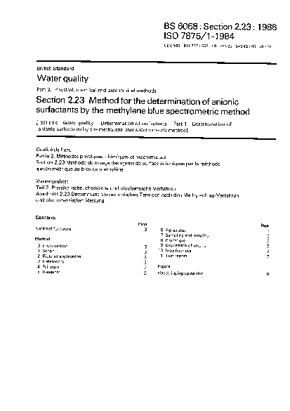 Water quality. Physical, chemical and biochemical methods Method for the determination of anionic surfactants by methylene blue spectrometric method