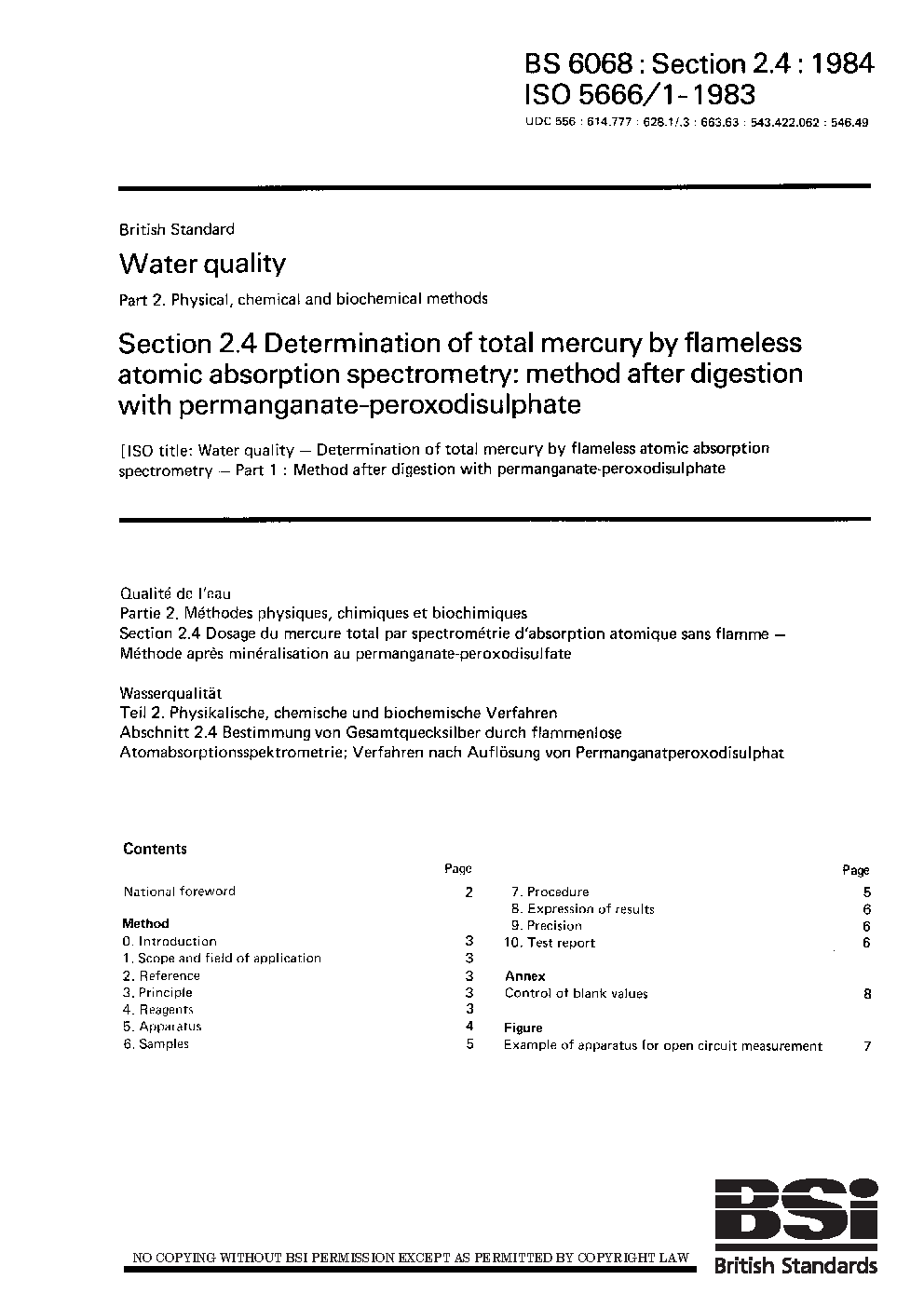 Water quality. Physical, chemical and biochemical methods Determination of total mercury by flameless atomic absorption spectrometry: method after digestion with permanganate-peroxodisulphate