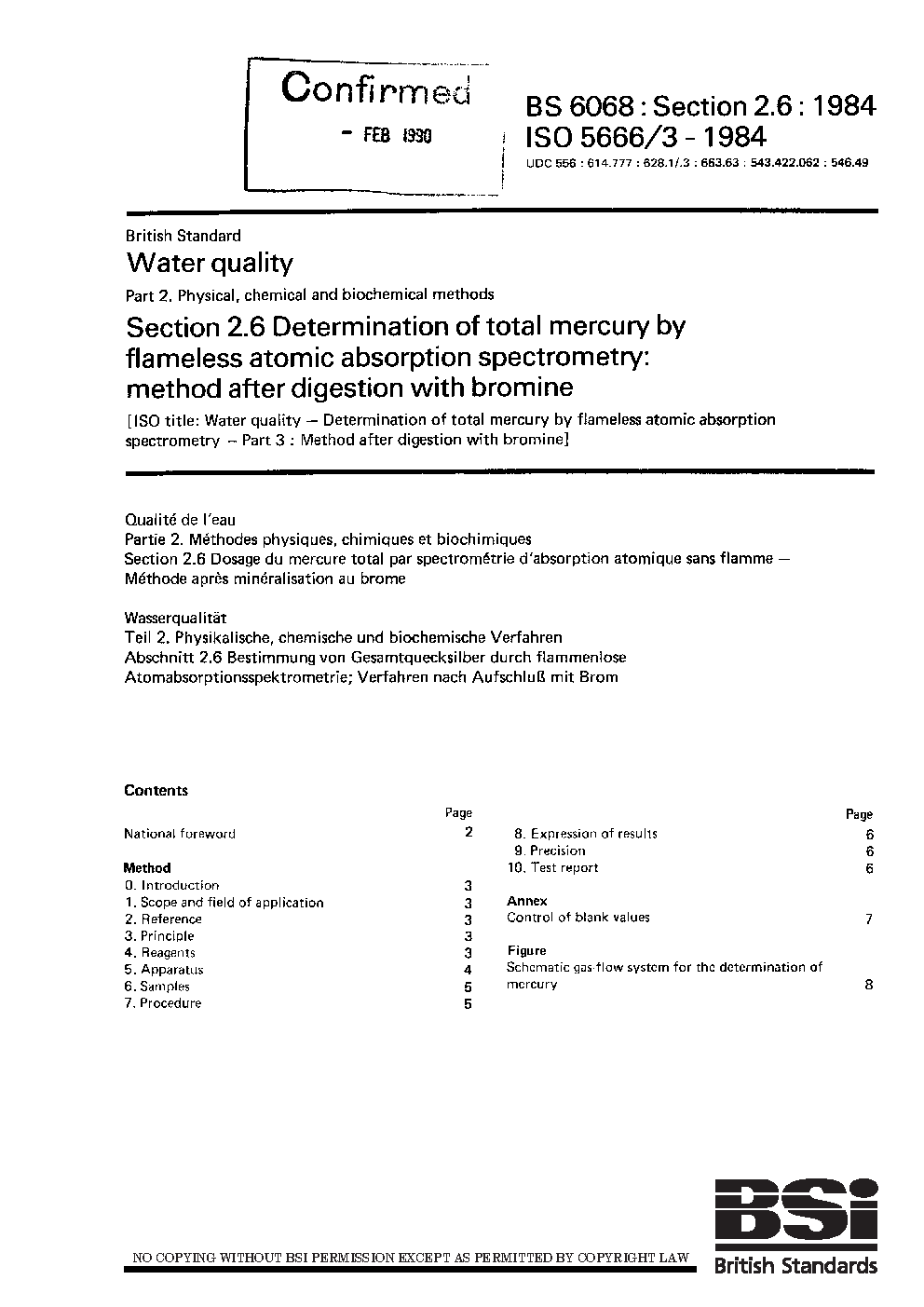 Water quality. Physical, chemical and biochemical methods Determination of total mercury by flameless atomic absorption spectrometry: method after digestion with bromine