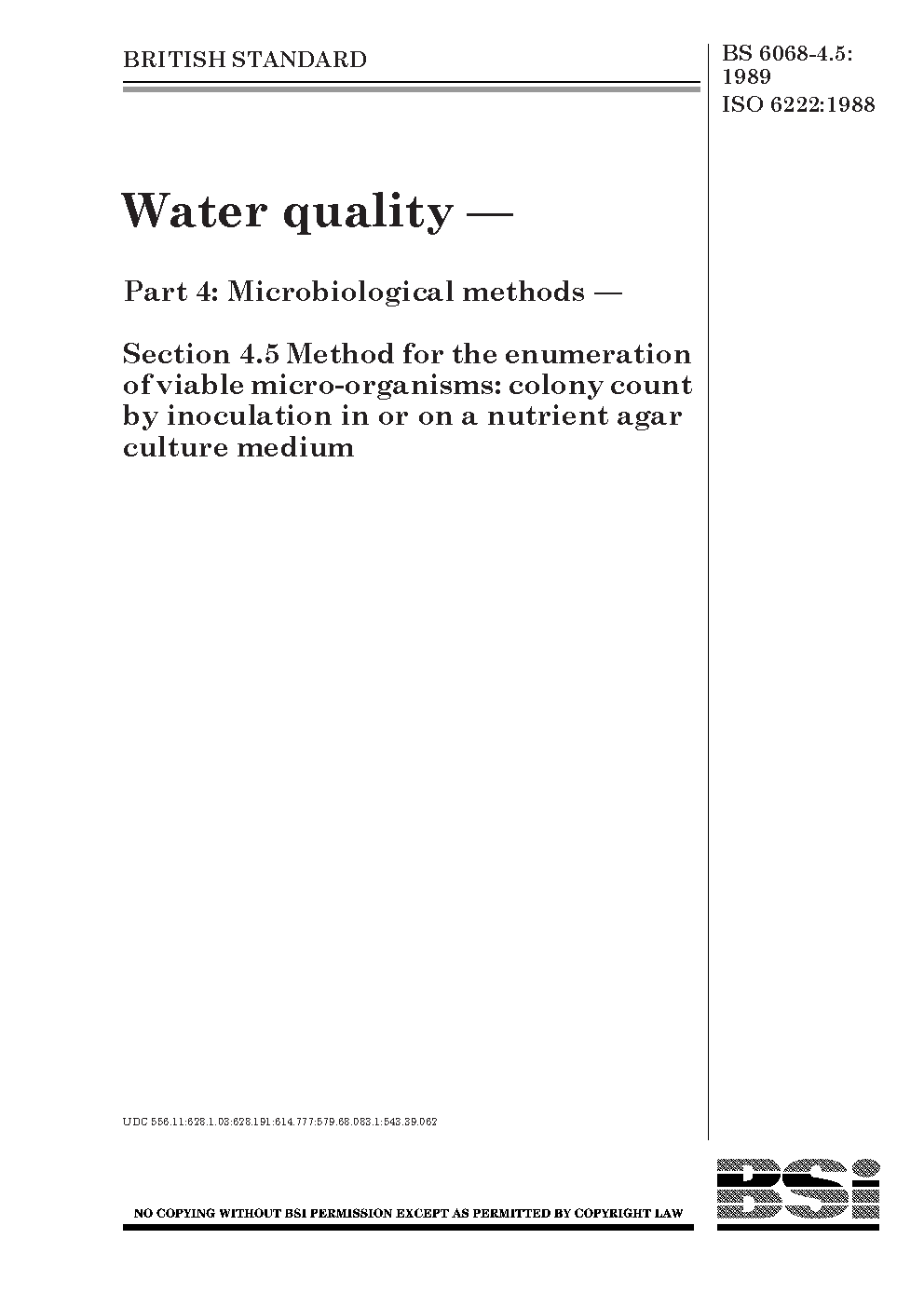 Water quality. Microbiological methods Method for the enumeration of viable micro-organisms: colony count by inoculation in or on a nutrient agar culture medium
