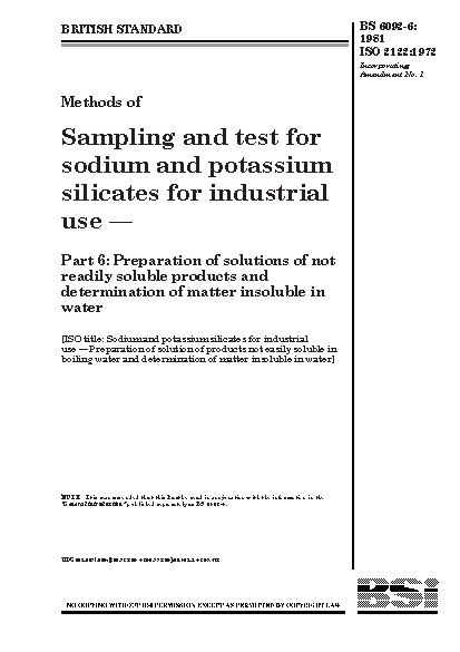 Methods of sampling and test for sodium potassium silicates industrial use Preparation solutions not readily soluble products determination matter insoluble in water