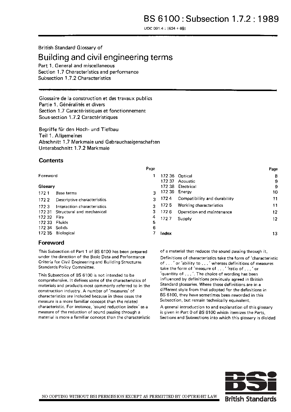 Glossary of building and civil engineering terms. General miscellaneous. Characteristics performance