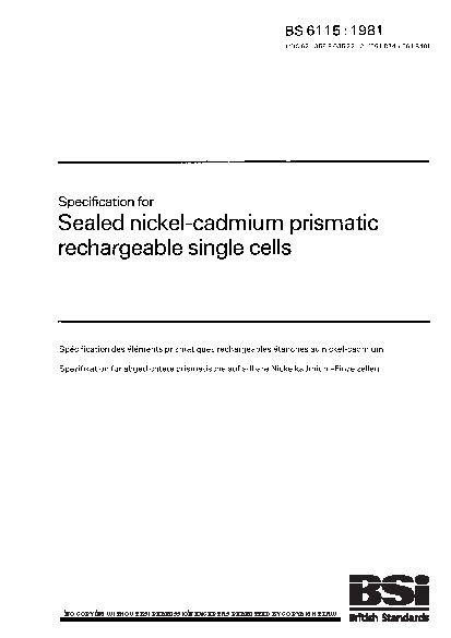 Specification for sealed nickel-cadmium prismatic rechargeable single cells