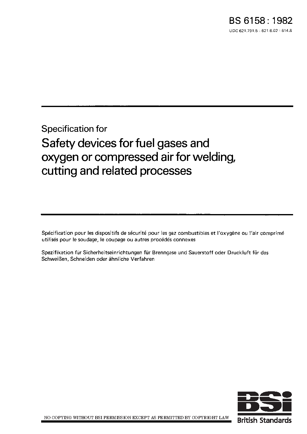 Specification for safety devices for fuel gases and oxygen or compressed air for welding, cutting and related processes