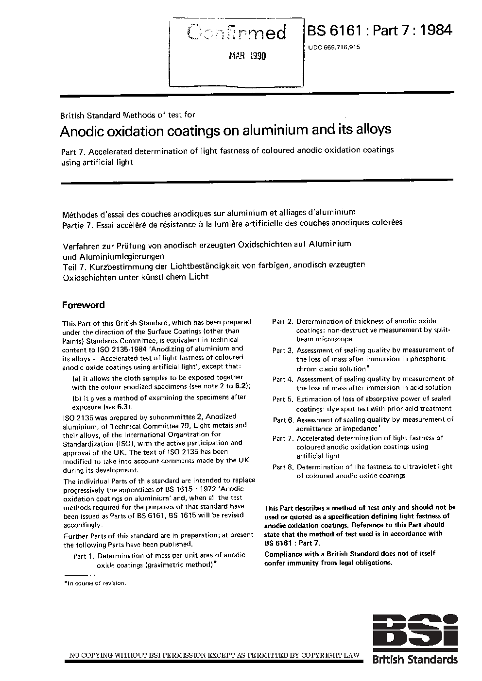 Methods of test for anodic oxidation coatings on aluminium and its alloys Accelerated determination light fastness coloured using artificial