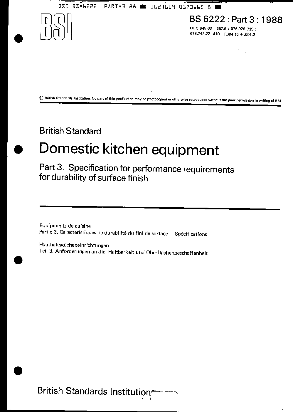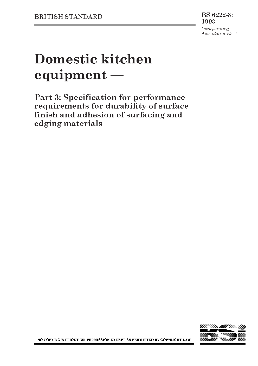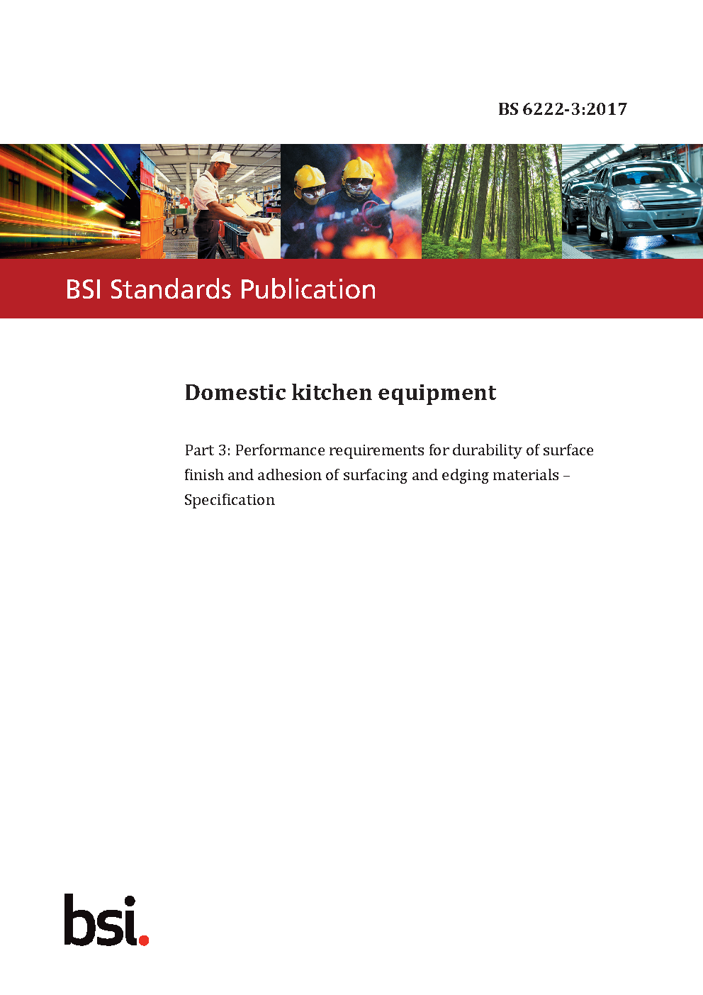 Domestic kitchen equipment Performance requirements for durability of surface finish and adhesion surfacing edging materials. Specification