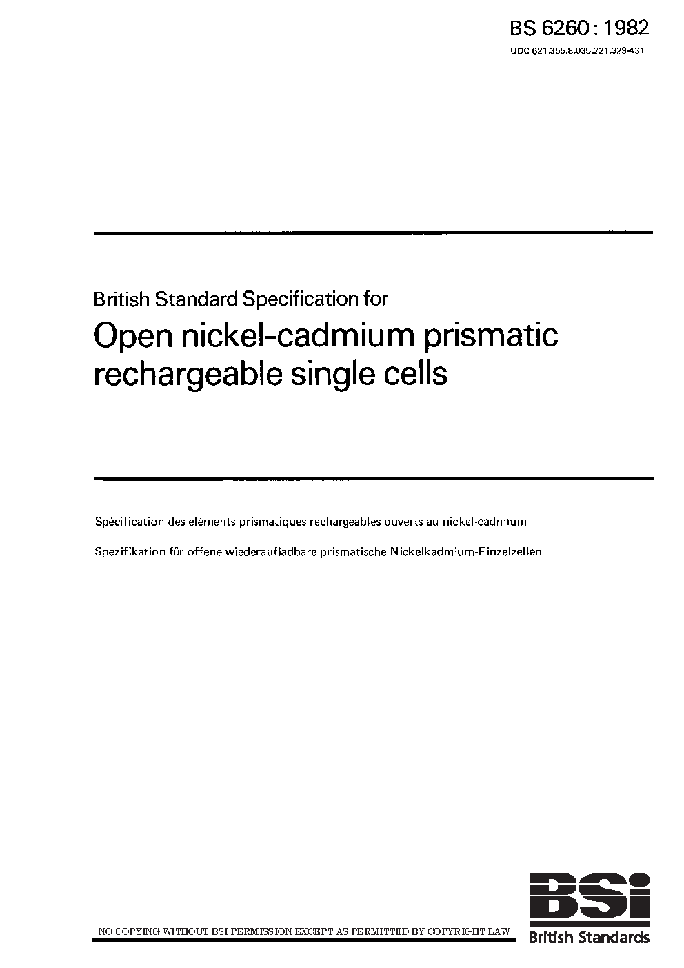 Specification for open nickel-cadmium prismatic rechargeable single cells