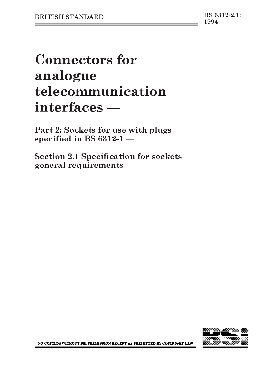 Connectors for analogue telecommunication interfaces. Sockets use with plugs specified in BS 6312:Part 1 Specification sockets. General requirements
