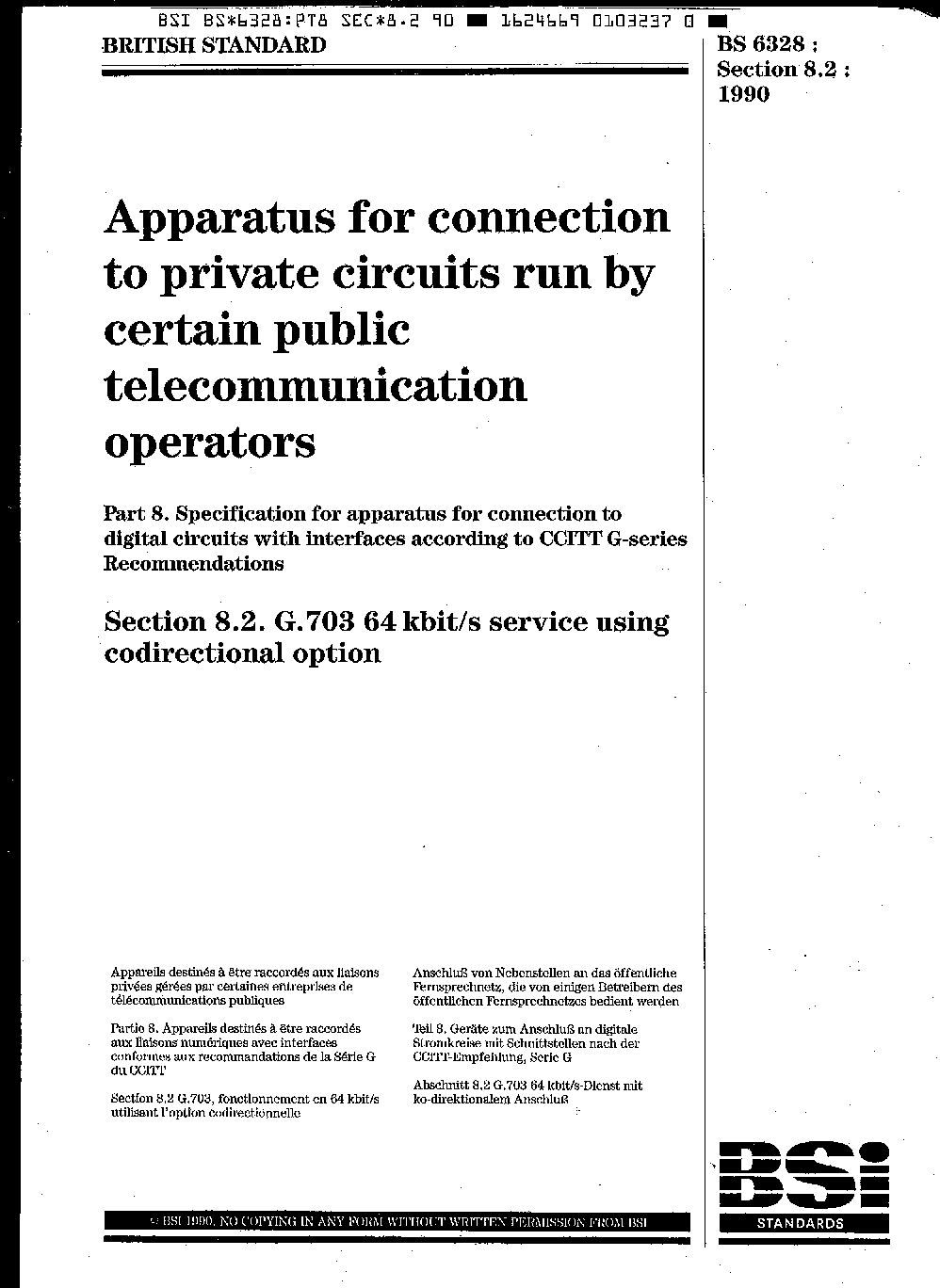 Apparatus for connection to private circuits run by certain public telecommunication operators. Specification apparatus digital with interfaces according CCITT G-series Recommendations G.703 64 kbit/s service using codirectional option
