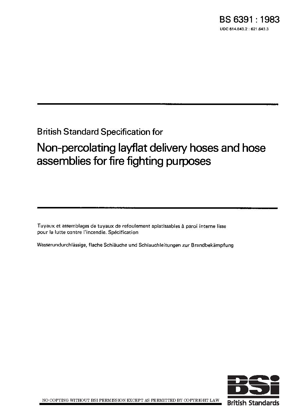 Specification for non-percolating layflat delivery hoses and hose assemblies for fire fighting purposes