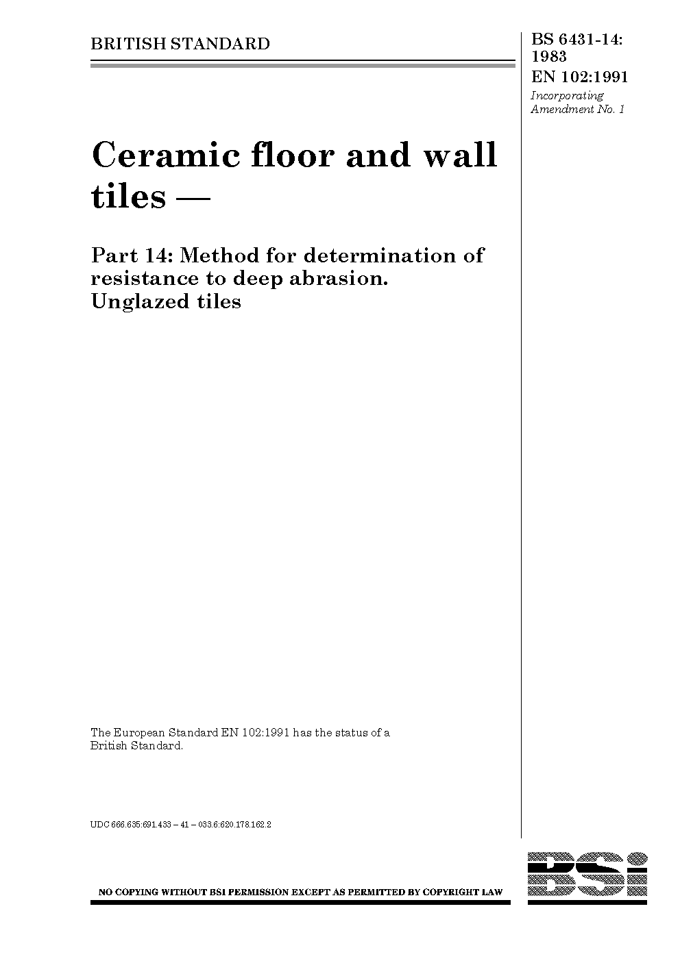 Ceramic floor and wall tiles Method for determination of resistance to deep abrasion. Unglazed