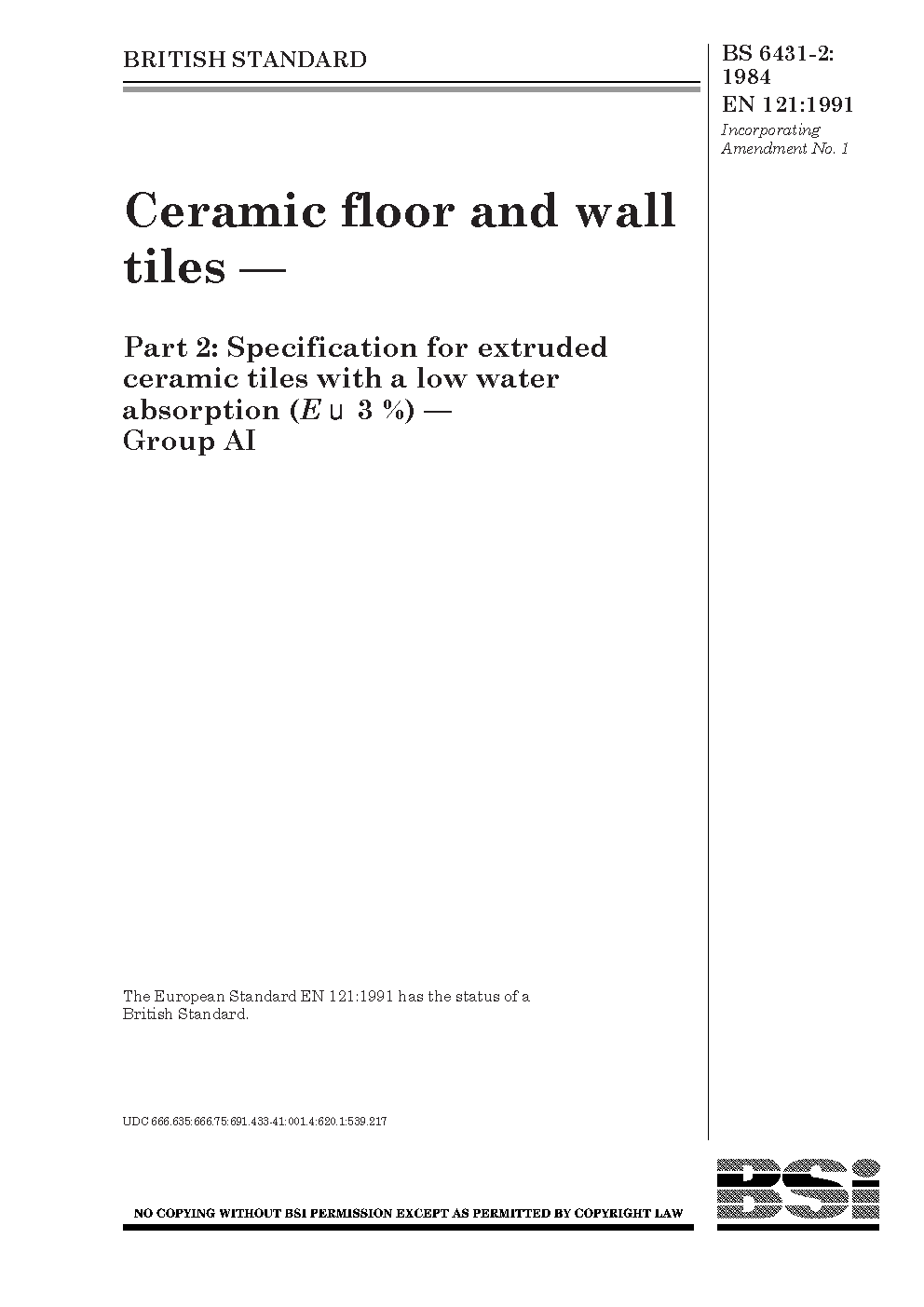 Ceramic floor and wall tiles Specification for extruded ceramic with a low water absorption (E = 3%). Group A1