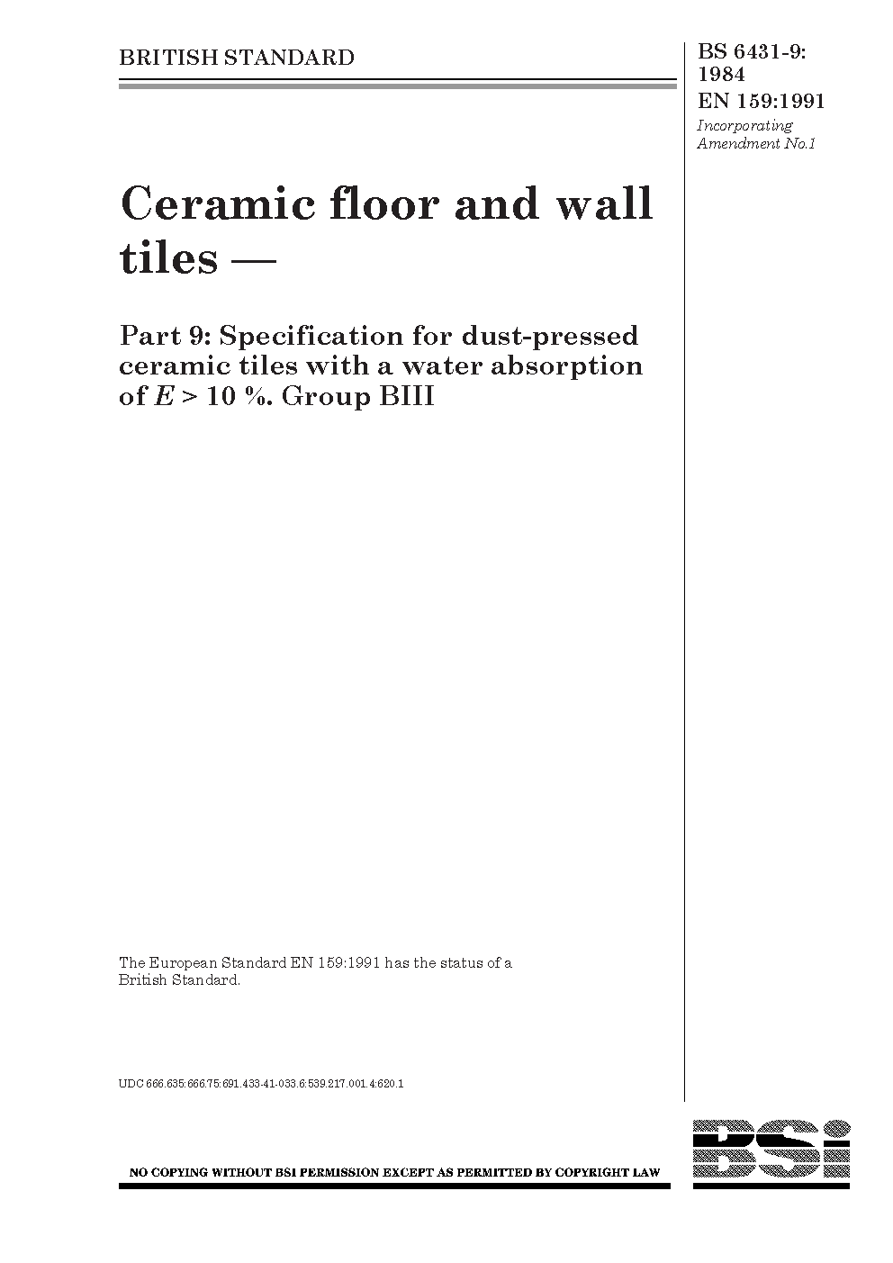 Ceramic floor and wall tiles Specification for dust-pressed ceramic with a water absorption of E > 10%. Group BIII