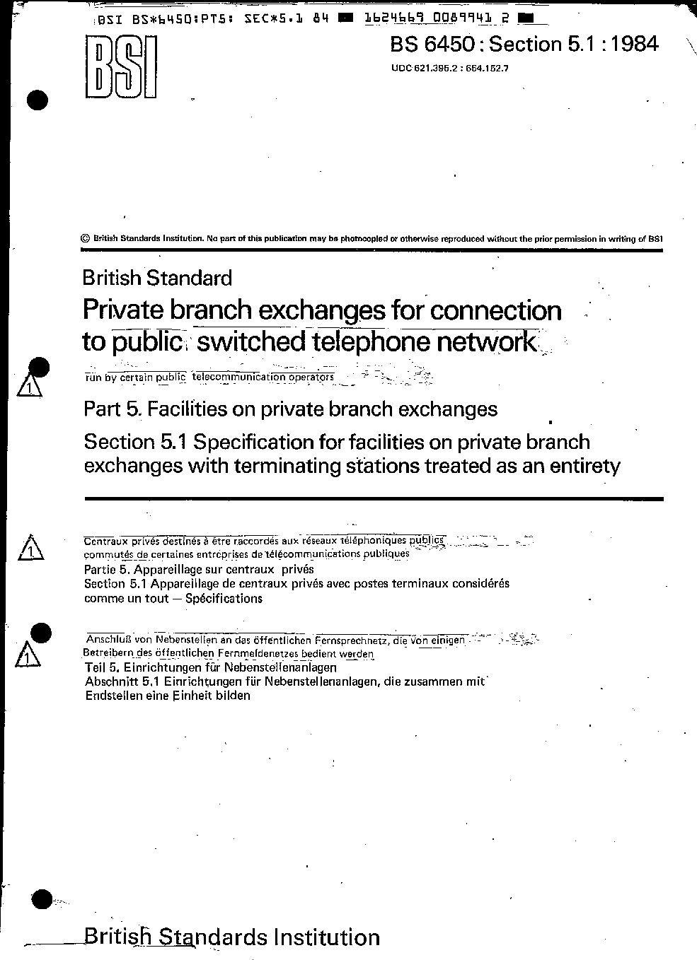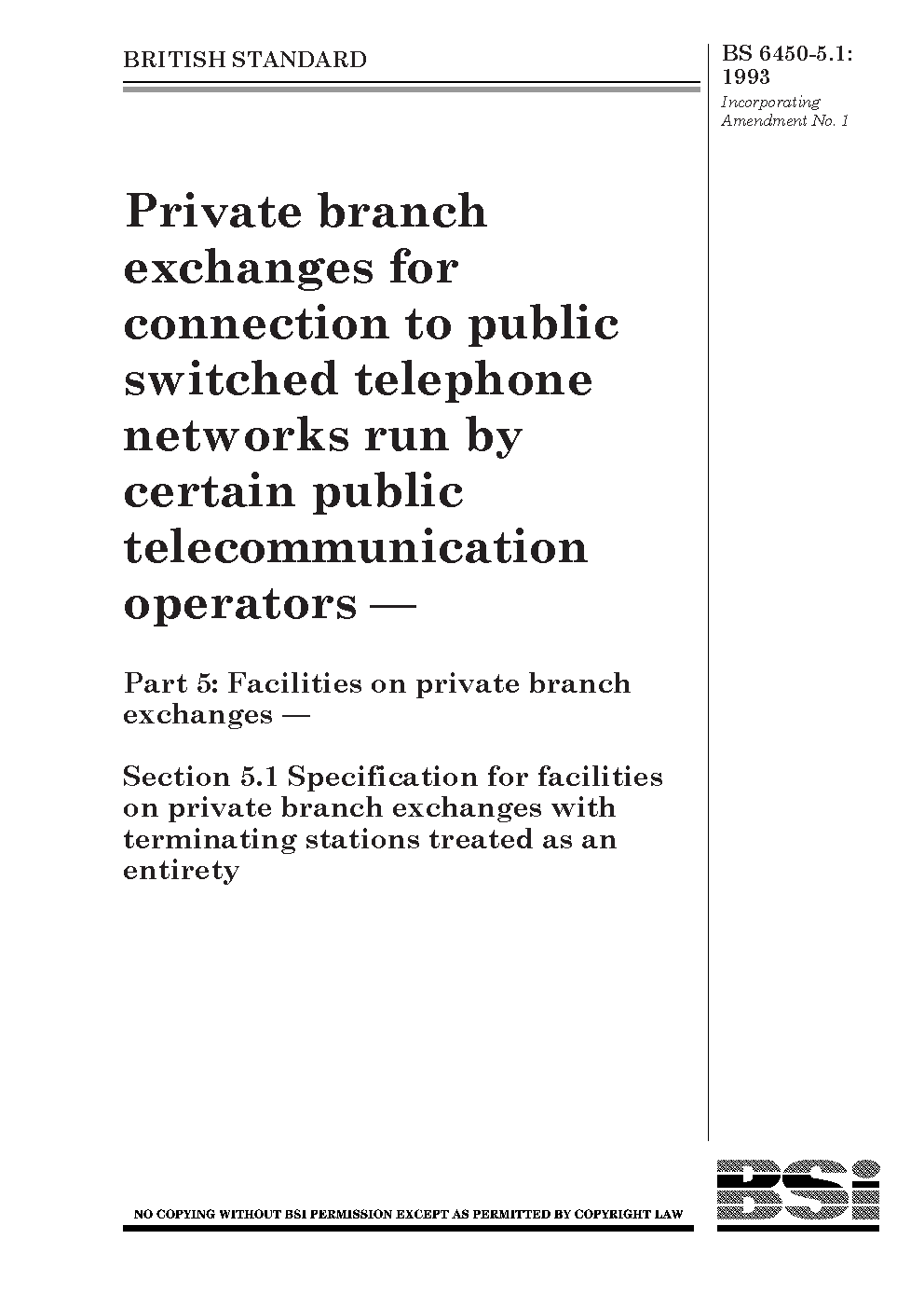 Private branch exchanges for connection to the British Telecommunications public switched telephone network. Facilities on private Specification facilities with terminating stations treated as an entirety