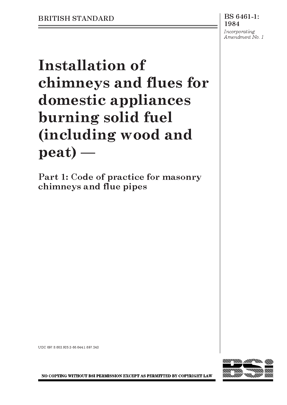 Installation of chimneys and flues for domestic appliances burning solid fuel (including wood peat) Code practice masonry flue pipes