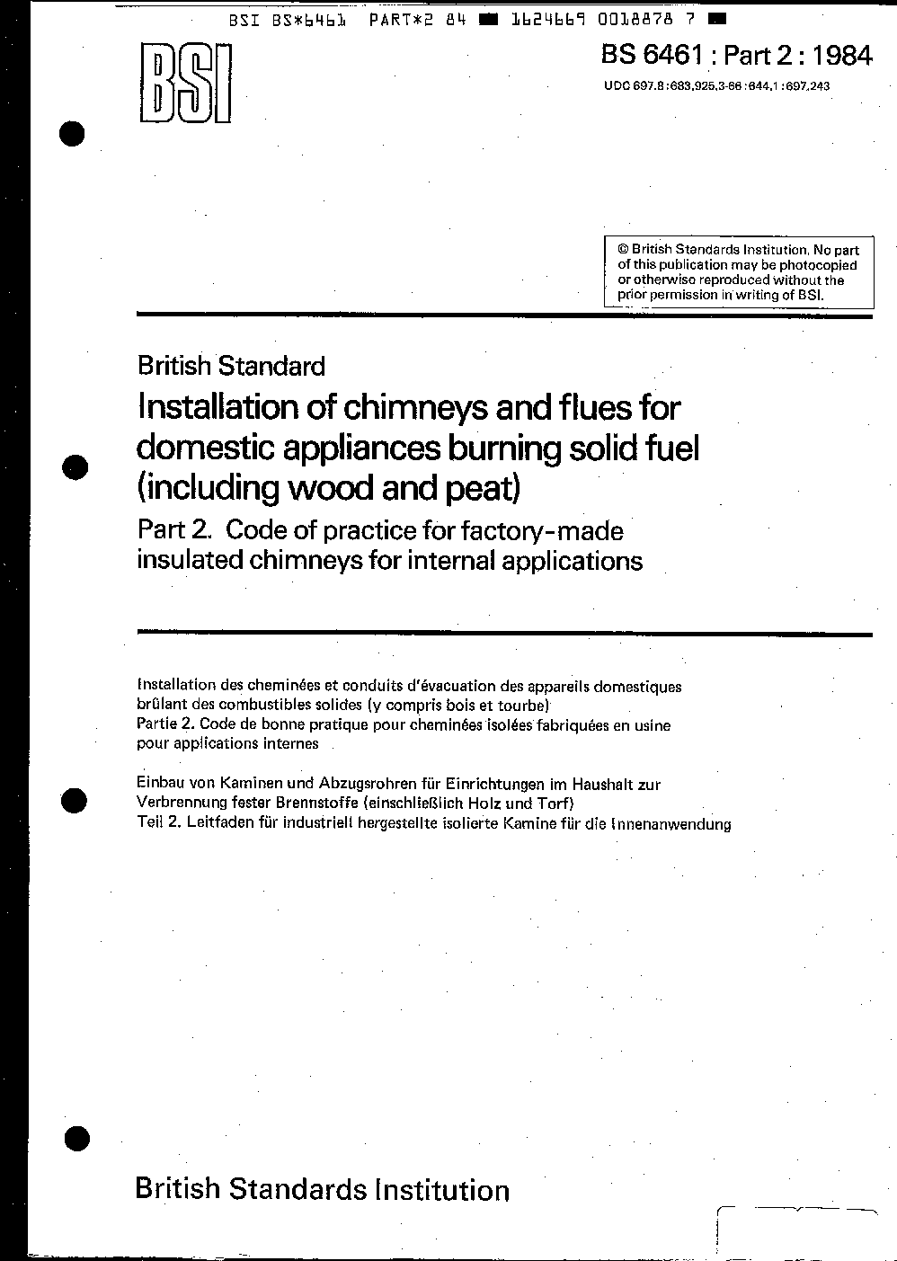Installation of chimneys and flues for domestic appliances burning solid fuel (including wood peat) Code practice factory-made insulated internal applications