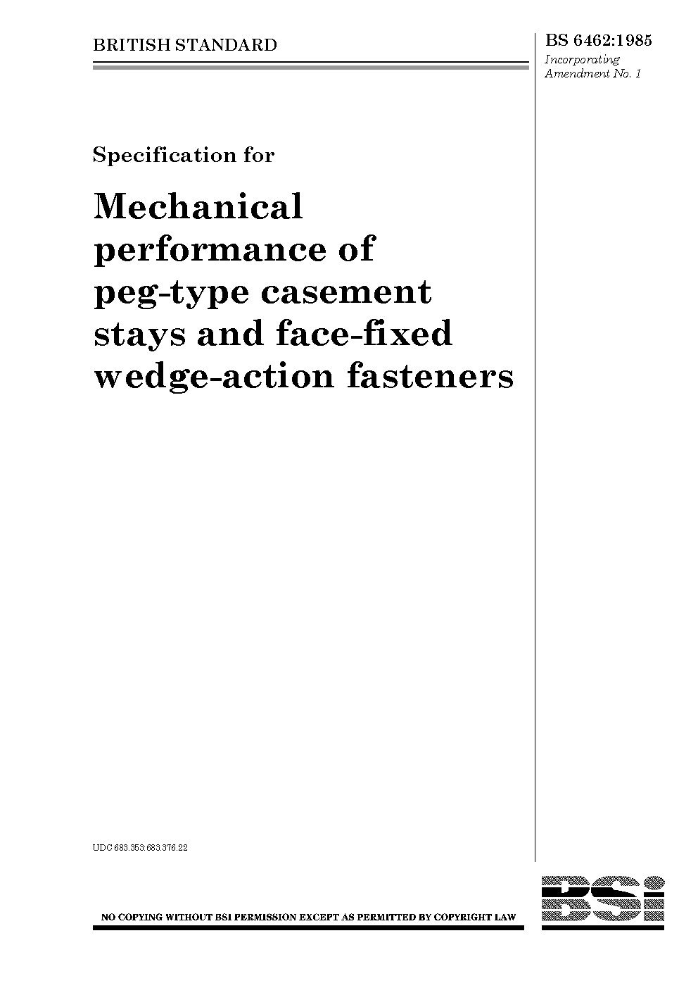 Specification for mechanical performance of peg-type casement stays and face-fixed wedge-action fasteners