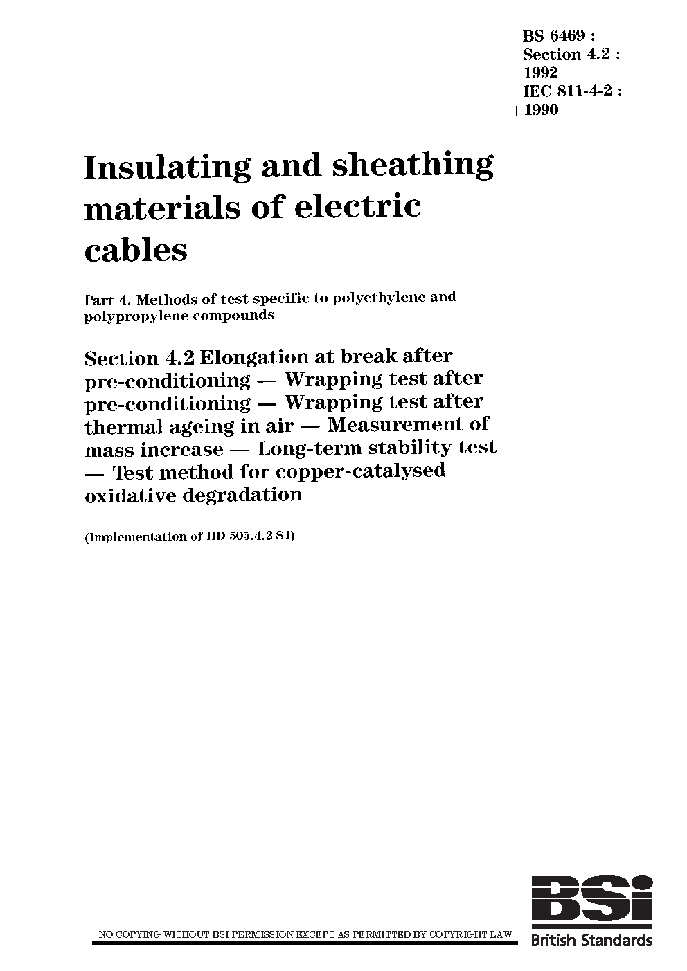 Insulating and sheathing materials of electric cables. Methods test specific to polyethylene polypropylene compounds Elongation at break after pre-conditioning. Wrapping thermal ageing in air. Measurement mass increase. Long-term stability test. Test method for copper-catalysed oxidative degradation