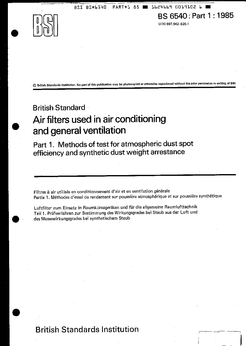 Air filters used in air conditioning and general ventilation Methods of test for atmospheric dust spot efficiency synthetic weight arrestance