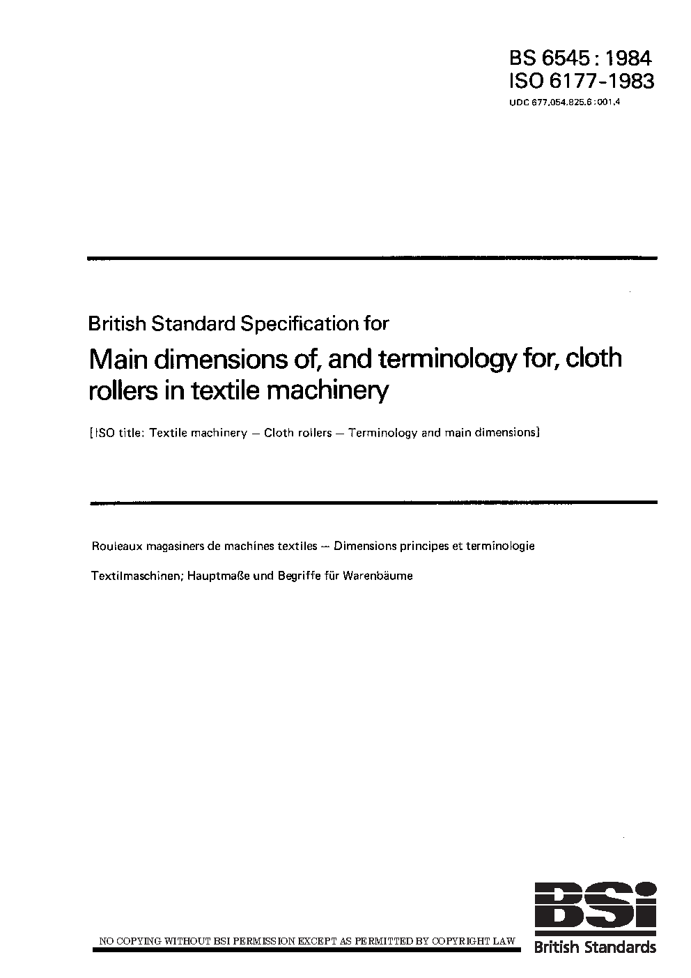 Specification for main dimensions of, and terminology for, cloth rollers in textile machinery