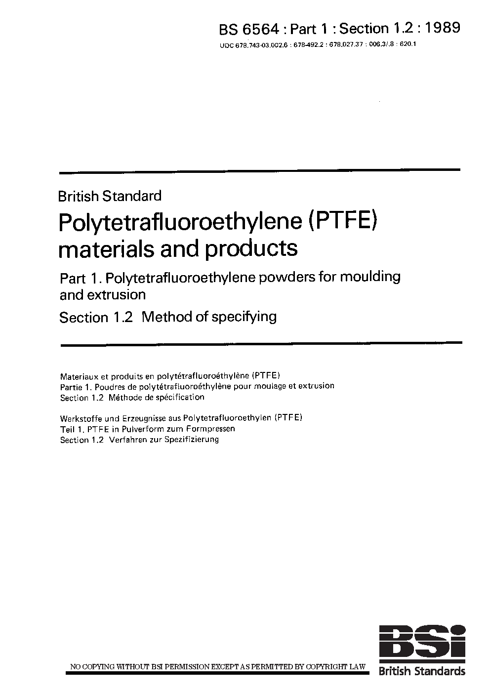 Method for specifying polytetrafluoroethylene powders of both filled and unfilled types. To be read in conjunction with BS 6564:Section 1.1
