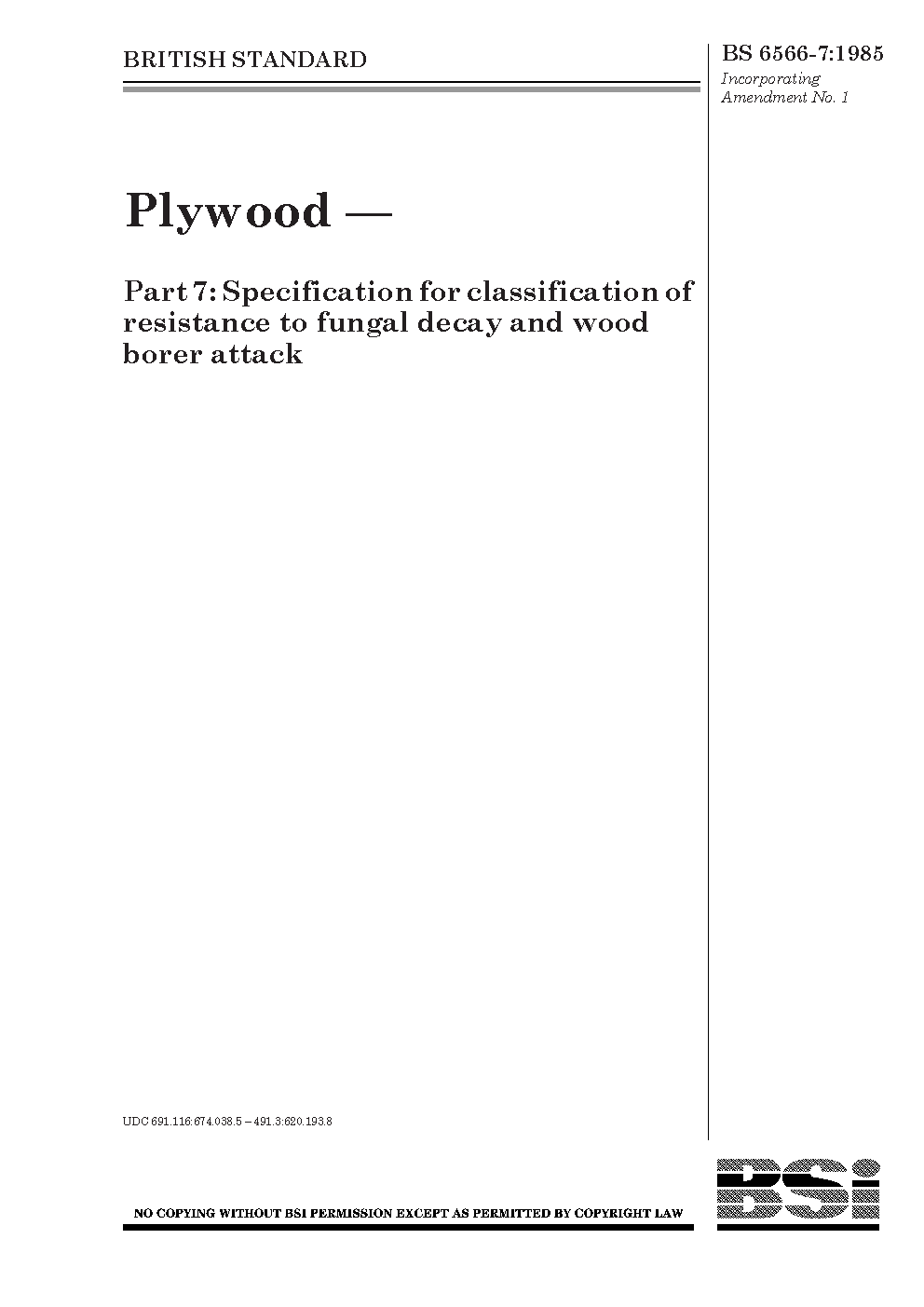 Plywood Specification for classification of resistance to fungal decay and wood borer attack