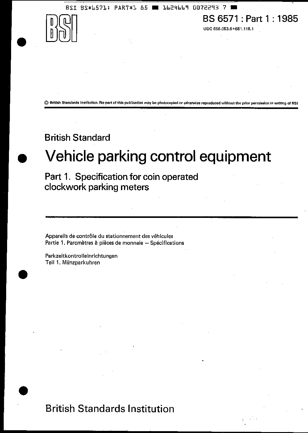 Vehicle parking control equipment Specification for coin operated clockwork meters