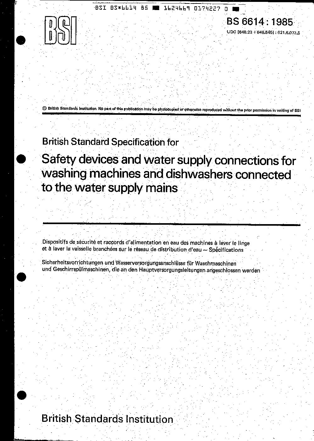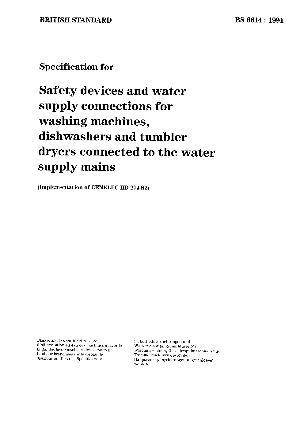 Specification for safety devices and water supply connections for washing machines and dishwashers connected to the water supply mains