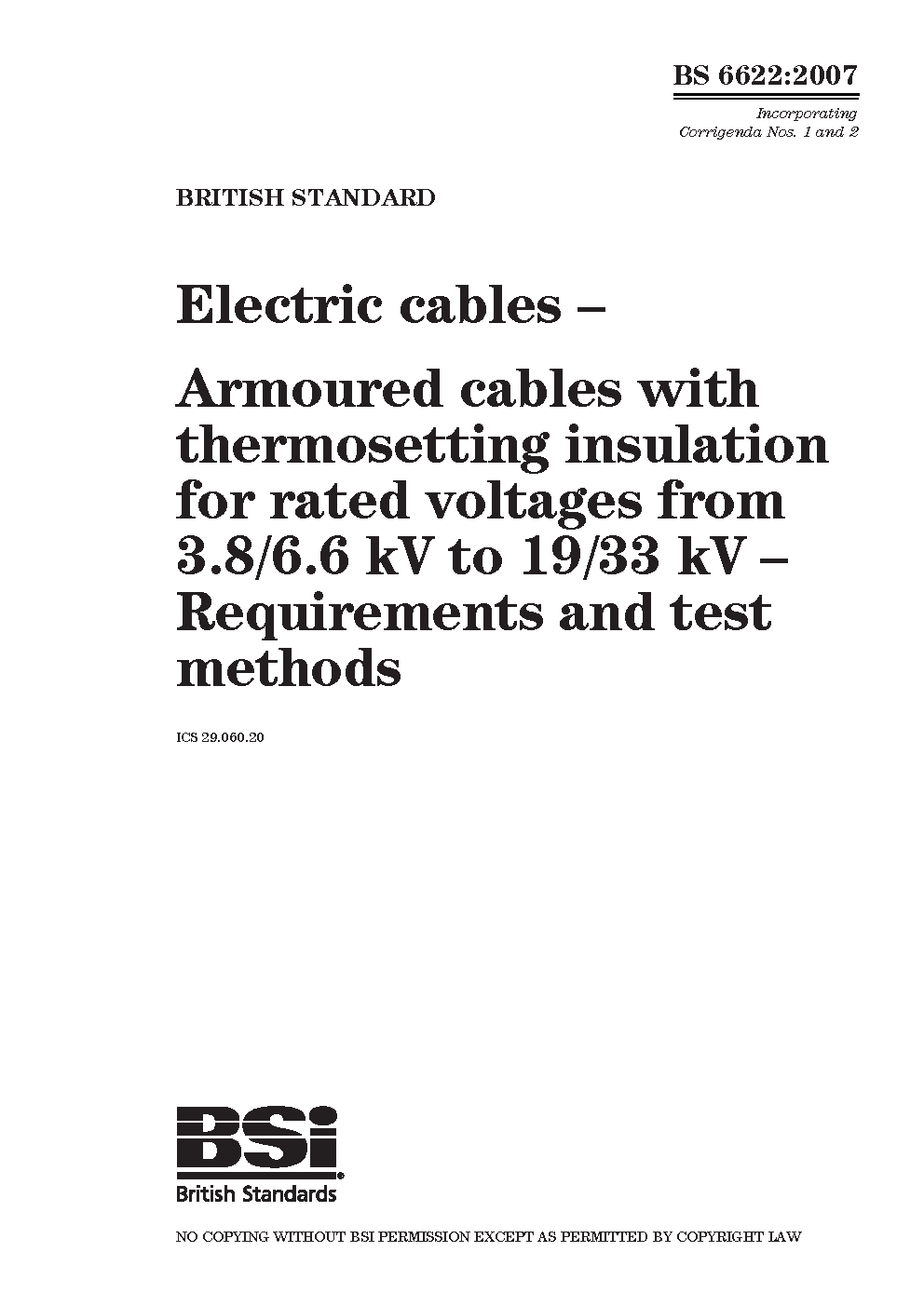 Electric cables. Armoured cables with thermosetting insulation for rated voltages from 3.8/6.6 kV to 19/33 kV. Requirements and test methods