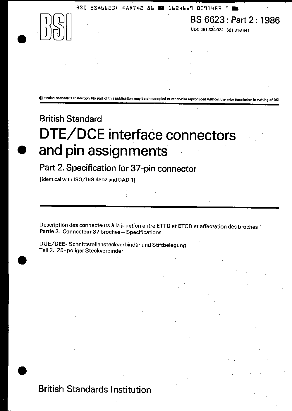 DTE/DCE interface connectors and pin assignments Specification for 37-pin connector [identical with ISO/DIS 4902 DAD 1]