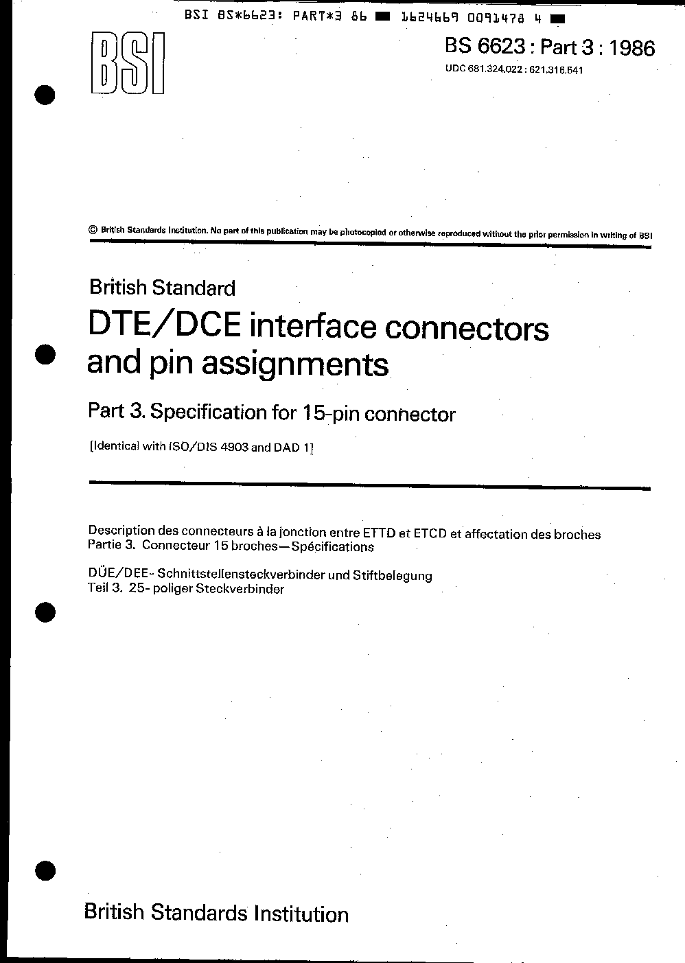 DTE/DCE interface connectors and pin assignments Specification for 15-pin connector [identical with ISO/DIS 4903 DAD 1]
