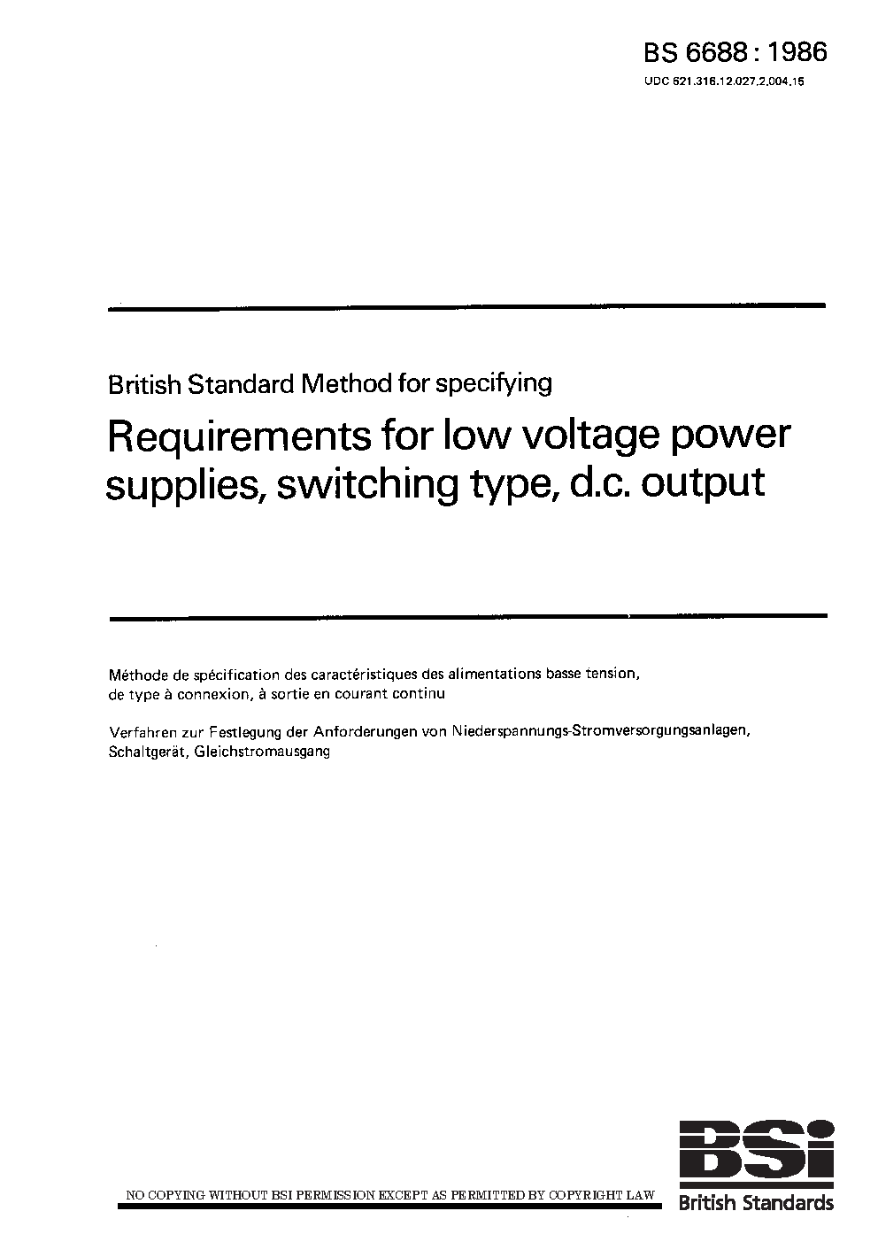 Method for specifying requirements for low voltage power supplies, switching type, d.c. output