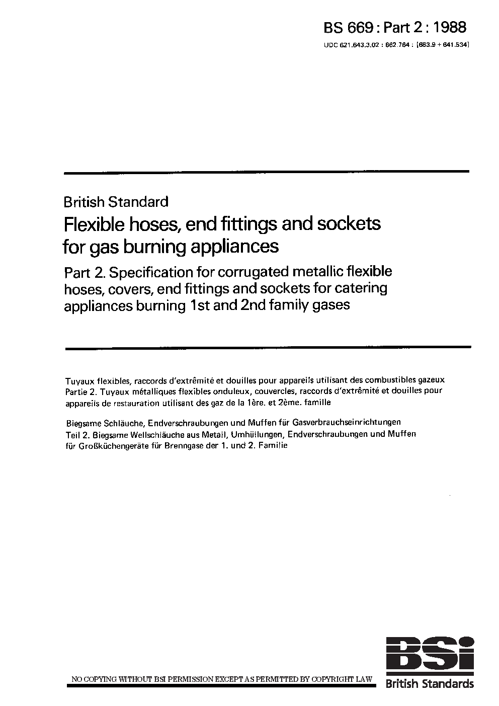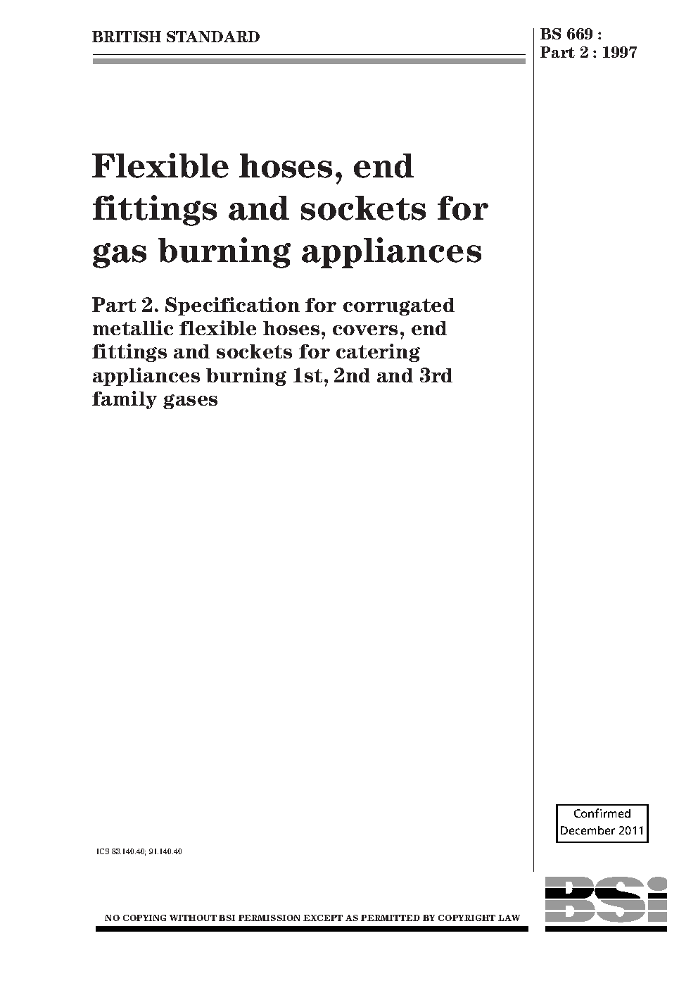 Flexible hoses, end fittings and sockets for gas burning appliances Specification corrugated metallic flexible covers, catering 1st 2nd family gases