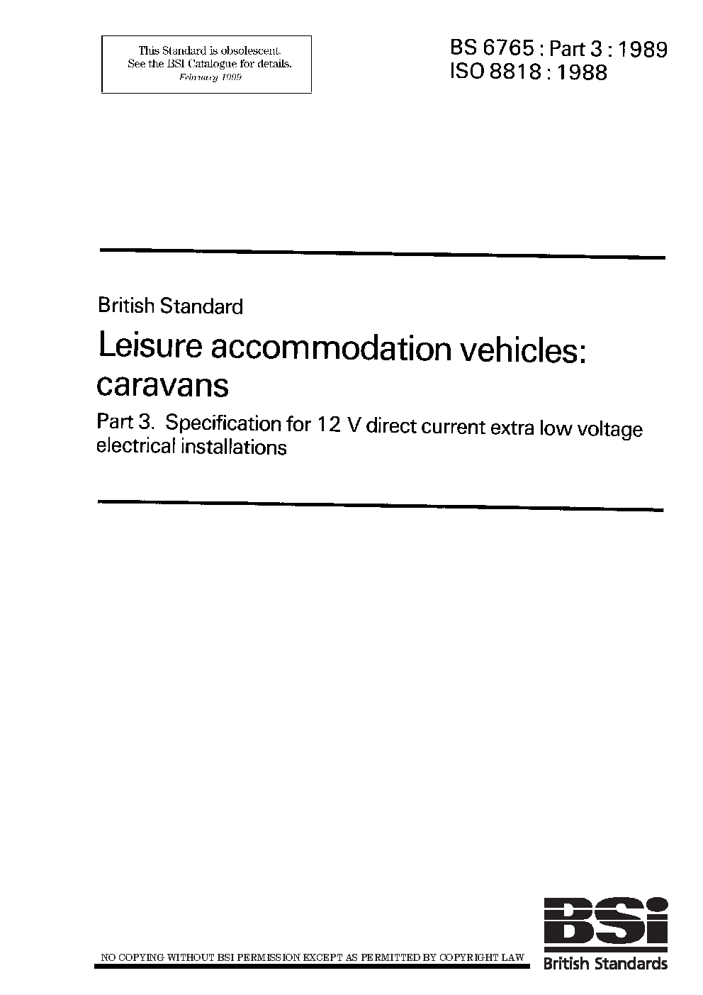 Leisure accommodation vehicles. Caravans Specification for 12 V direct current extra low voltage electrical installations