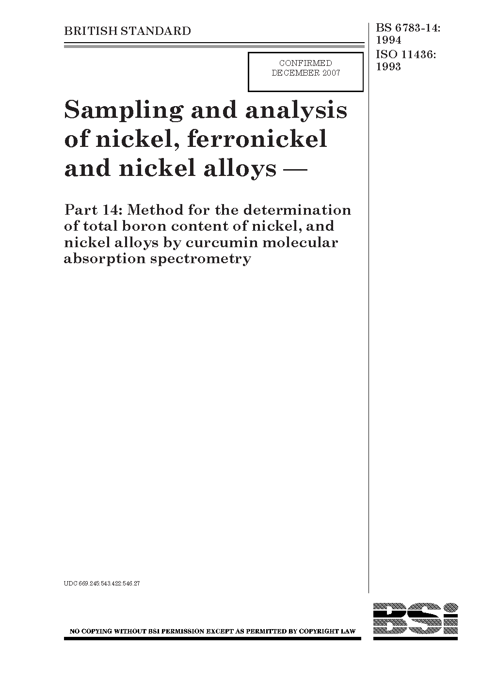 Nickel;Specimen preparation;Nickel alloys;Chemical composition;Reproducibility;Calibration;Molecular absorption spectrophotometry;Test equipment;Control samples;Complexing methods;Chemical analysis and testing;Determination of content;Boron;Testing conditions