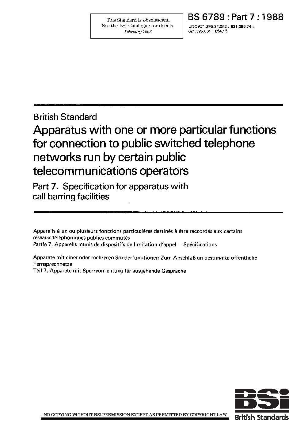 Apparatus with one or more particular functions for connection to public switched telephone networks run by certain telecommunications operators Specification apparatus call barring facilities