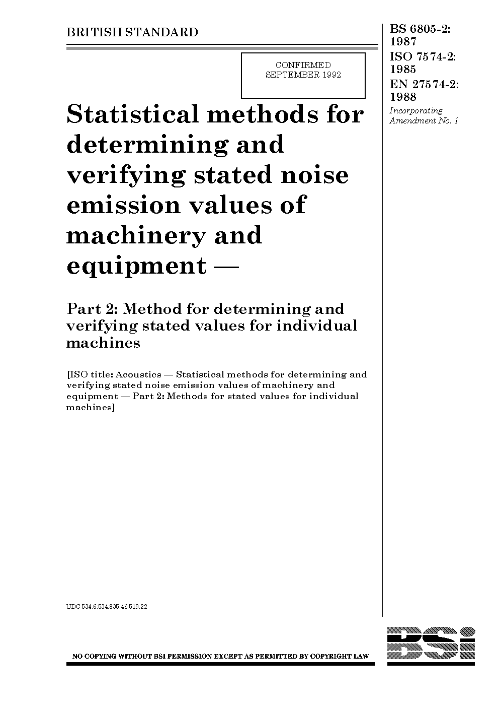 Statistical methods for determining and verifying stated noise emission values of machinery equipment Method individual machines