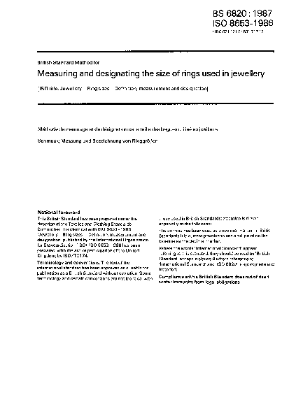 Method for measuring and designating the size of rings used in jewellery