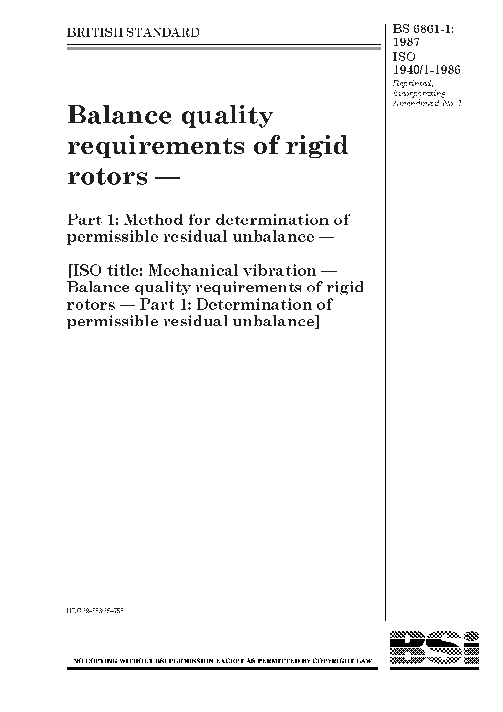 Mechanical vibration. Balance quality requirements of rigid rotors Method for determination permissible residual unbalance