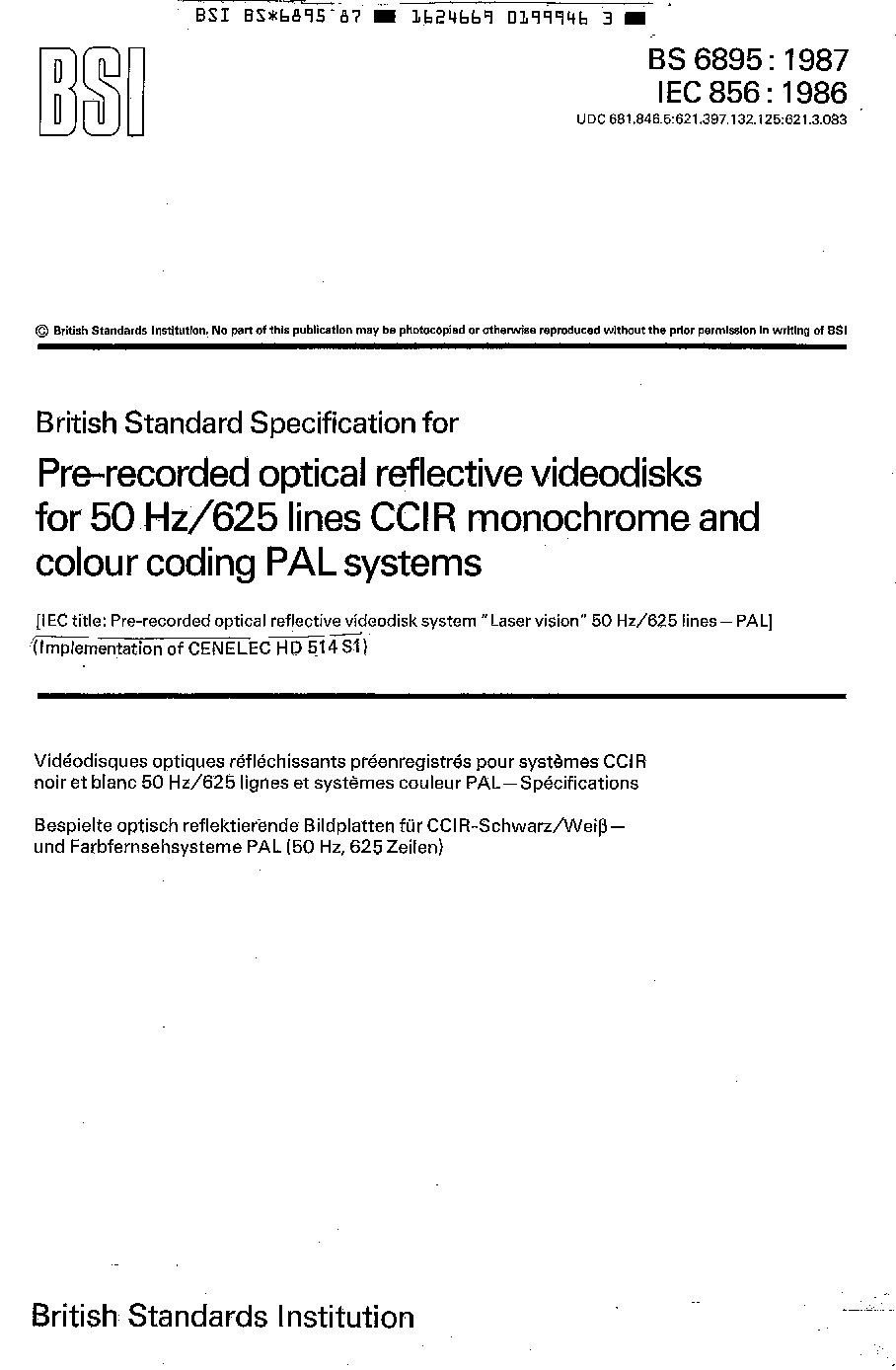 Specification for pre-recorded optical reflective videodisks for 50 Hz/625 lines CCIR monochrome and colour coding PAL systems