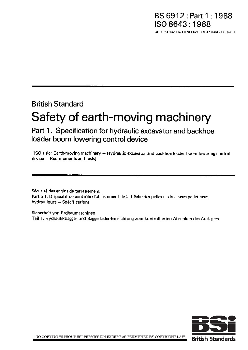 Safety of earth-moving machinery Specification for hydraulic excavator and backhoe loader boom lowering control device
