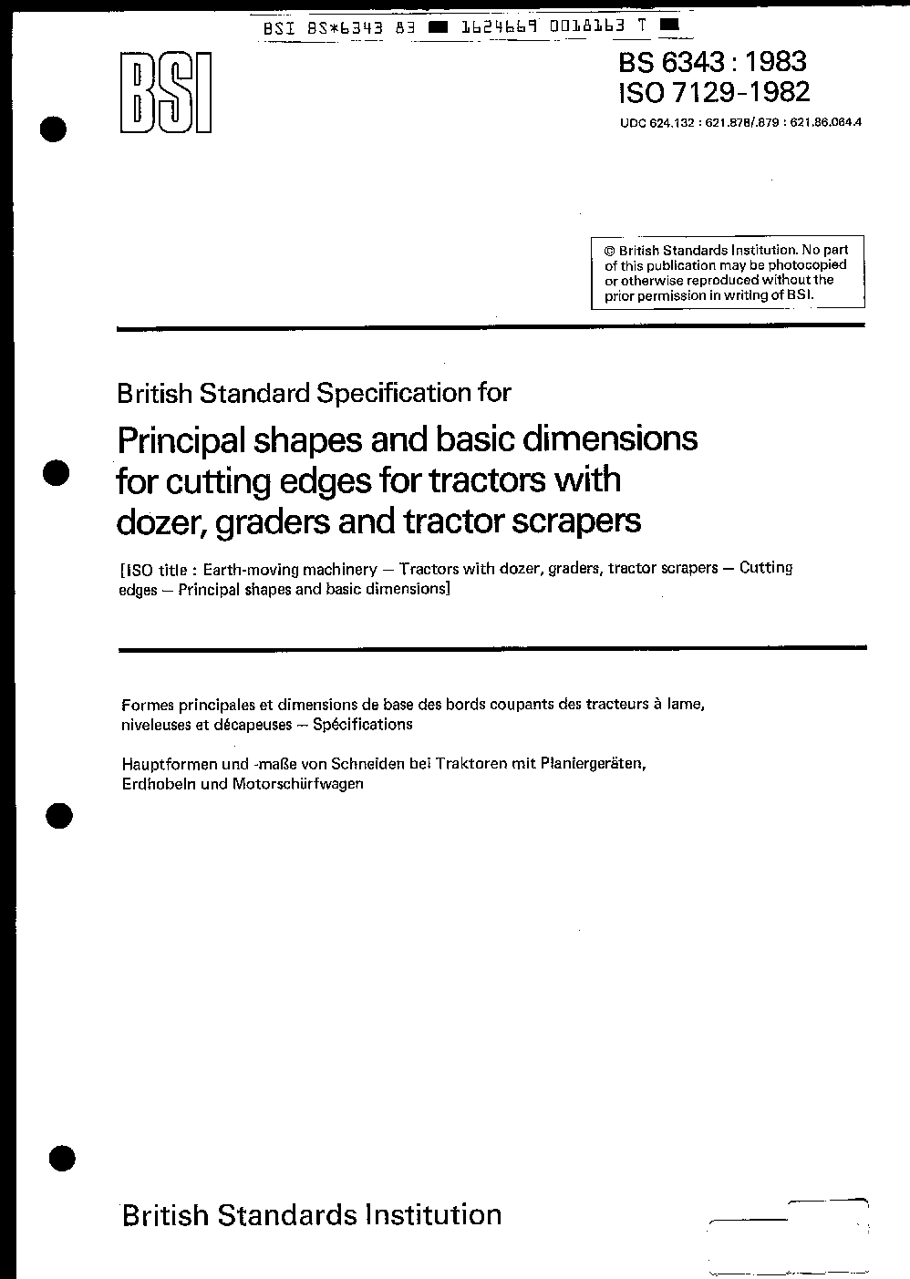 Operation and maintenance of earth-moving machinery Specification for principal shapes basic dimensions cutting edges tractors with dozer, graders tractor scrapers