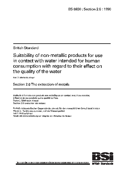 Suitability of non-metallic products for use in contact with water intended human consumption regard to their effect onthe quality the water. Methods test The extraction metals