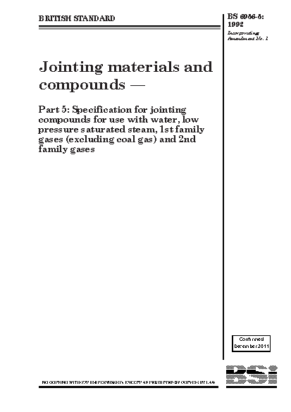 Jointing materials and compounds Specification for jointing use with water, low pressure saturated steam, 1st family gases (excluding coal gas) 2nd
