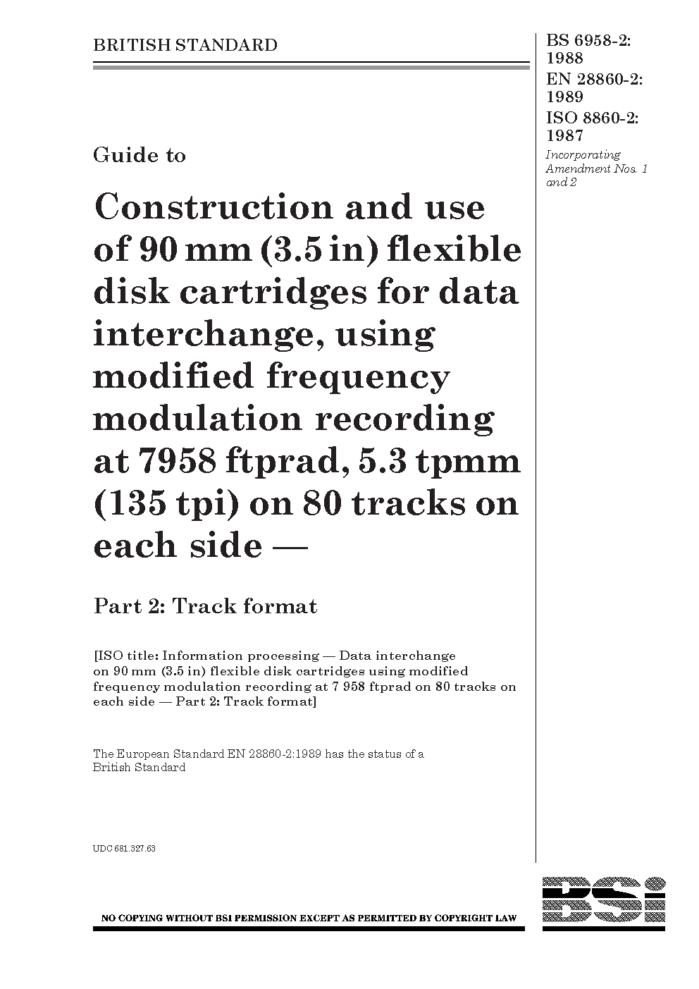 Guide to construction and use of 90 mm (3.5 in) flexible disk cartridges for data interchange, using modified frequency modulationrecording at 7958 ftprad, 5.3 tpmm (135 tpi) on 80 tracks each side Track format