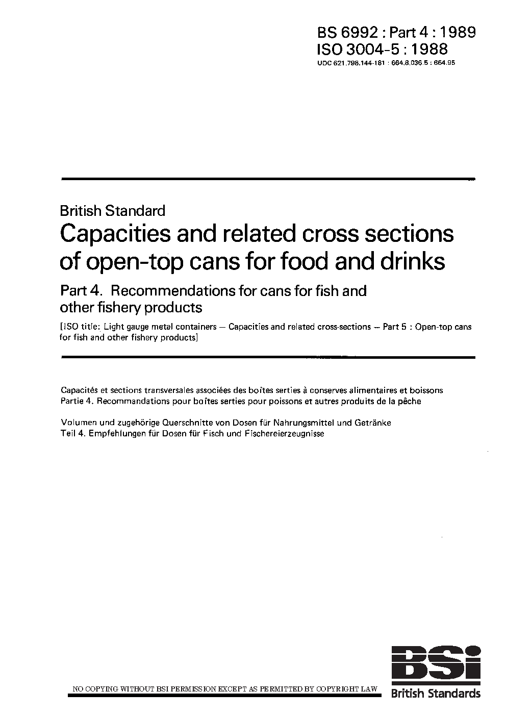 Capacities and related cross sections of open-top cans for food drinks Recommendations fish other fishery products