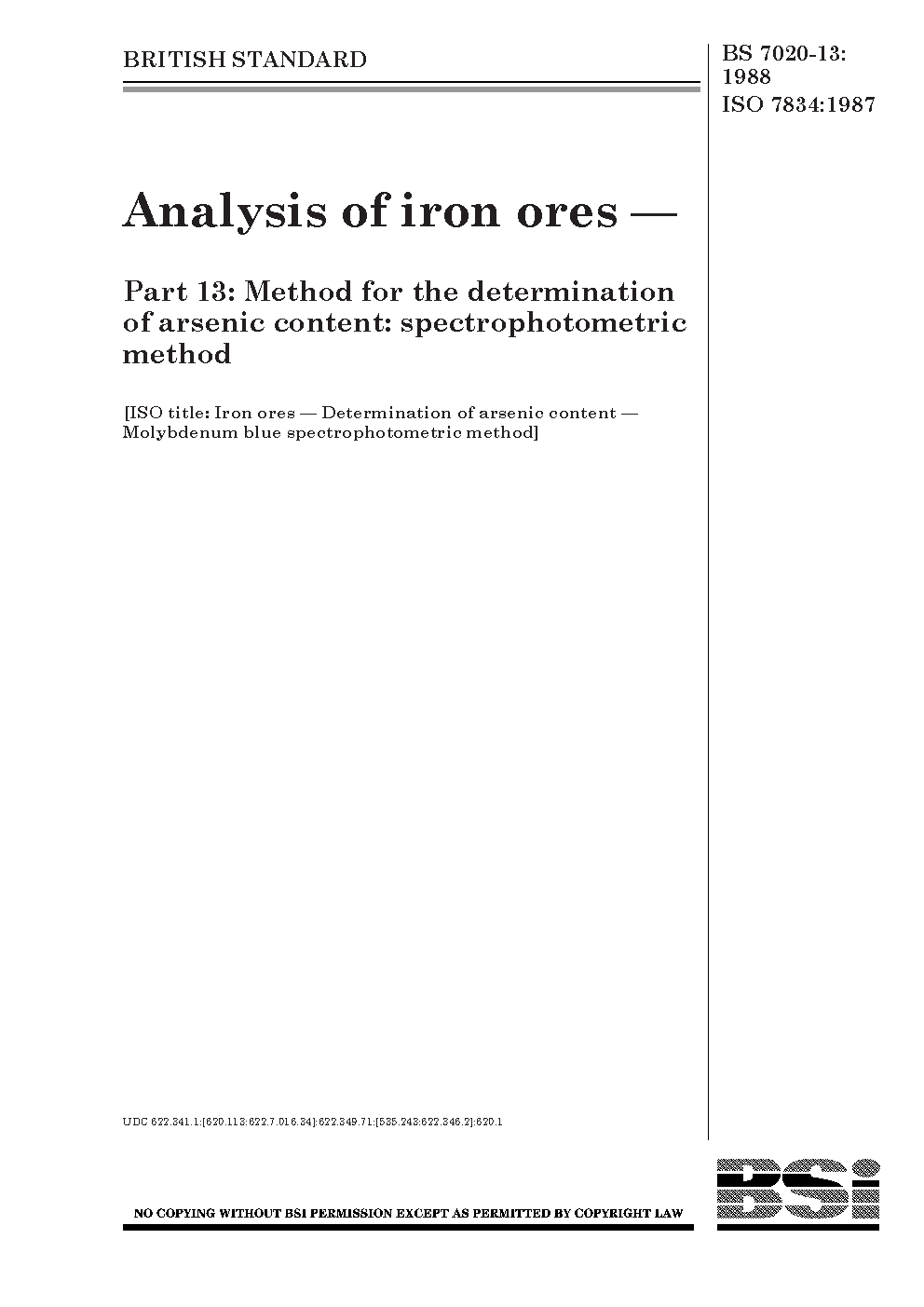 Spectrophotometry;Specimen preparation;Precision;Arsenic;Sintered products;Iron ores;Testing conditions;Concentration (chemical);Spectrochemical analysis;Statistical methods of analysis;Calibration;Distillation methods of analysis;Concentrates;Chemical analysis and testing;Determination of content;Reproducibility;Extraction methods of analysis;Test equipment;Conglomerates