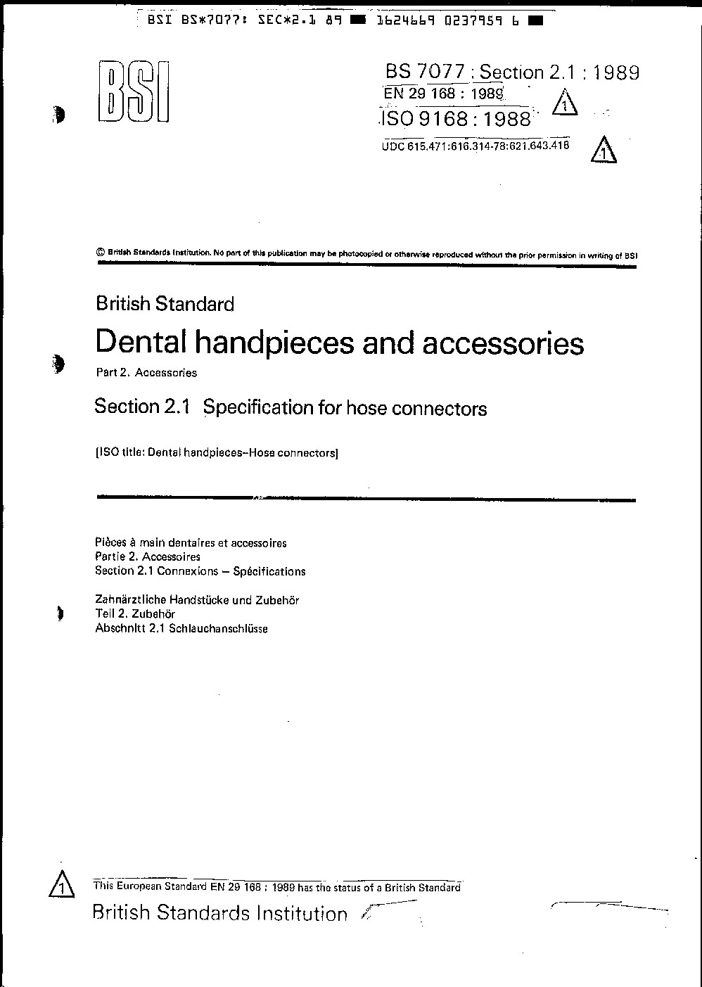 Dental handpieces and accessories. Accessories Specification for hose connectors