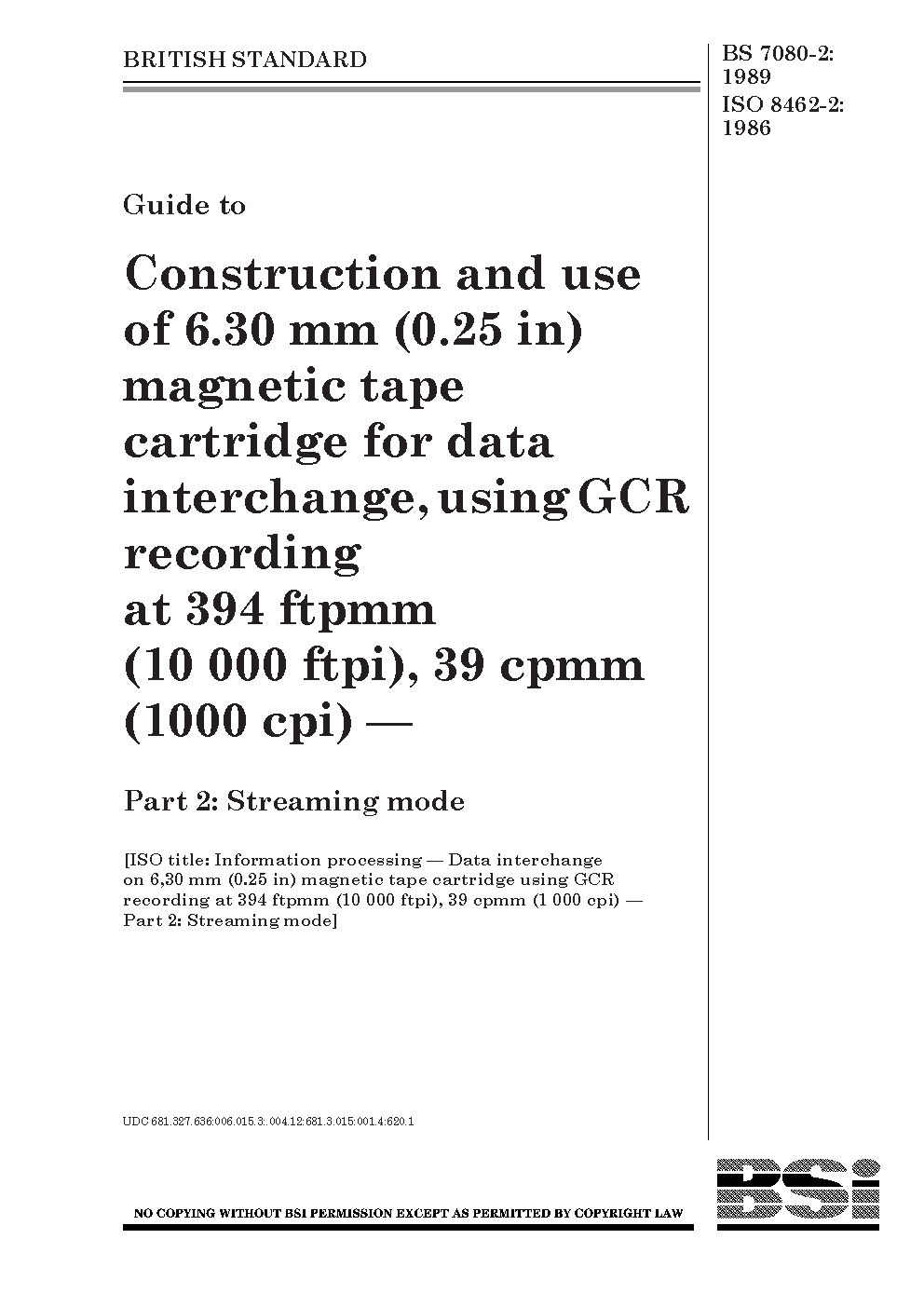 Guide to construction and use of 6.30 mm (0.25 in) magnetic tape cartridge using GCR for data interchange, recording at 394 ftpmm(10 000 ftpi), 39 cpmm (1 cpi) Streaming mode